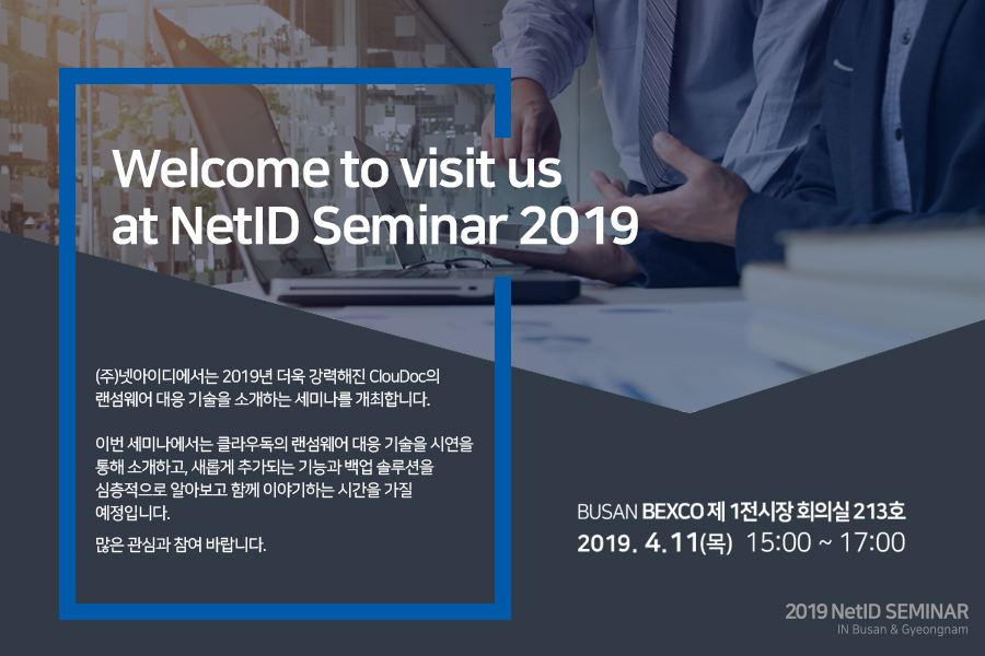 | [문서중앙화] '전자정부 정보보호 솔루션 페어 2019' 넷아이디가 여러분을 초대합니다! (0) | 2019.02.28 |