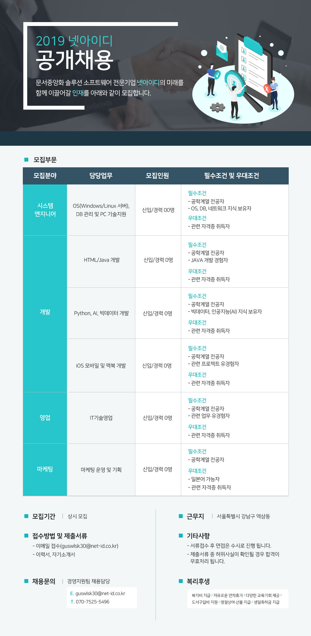 문서중앙화 솔루션 대표기업 넷아이디에서 미래를 함께 이끌어갈 인재를 모집합니다.