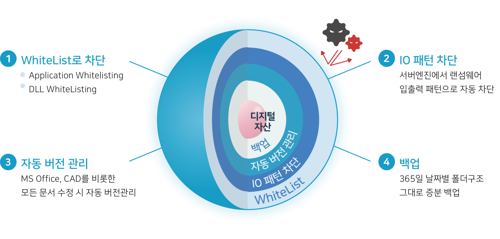 최근 나날이 지능화되는 랜섬웨어에 4단계 대응 방법을 통해 확실하고 지능적인 랜섬웨어 차단이 가능하고,