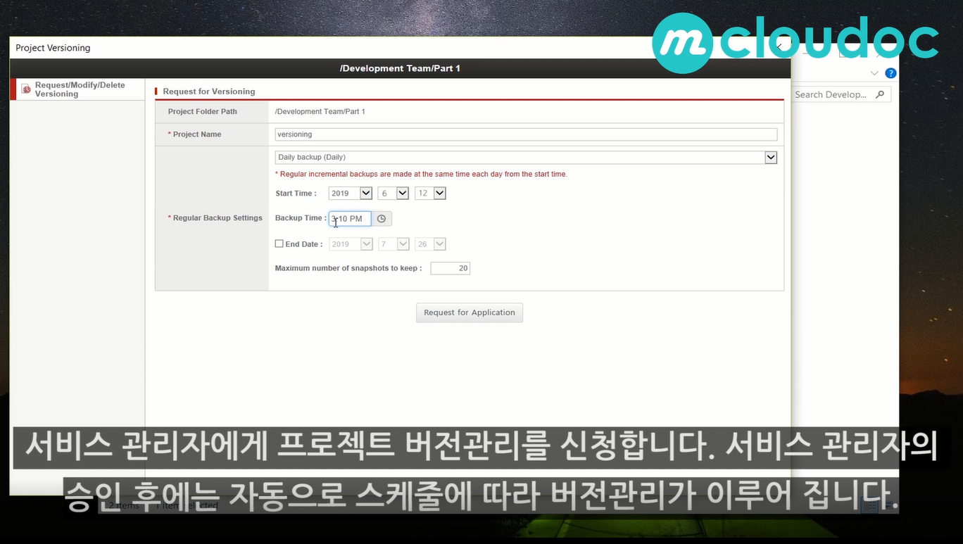 mcloudoc의 프로젝트 버전관리 기능은 아직 별도의 백업 솔루션을 도입하지 않은 경우에 더욱 유용하게 사용하실 수 있습니다.