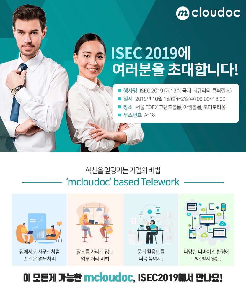 ISEC 2019에서 mcloudoc은 문서중앙화 기반의 Telework에 대해서 선보이고자 합니다.
