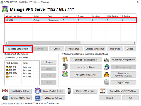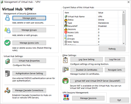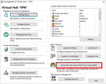 1) Management of Virtual Hub 콘솔에서 [Virtual NAT and Virtual DHCP Server (SecureNAT)] 버튼을 클릭합니다.