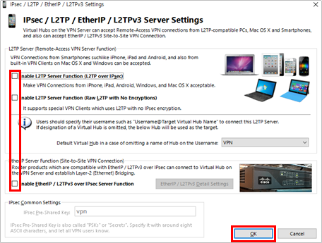 5) 모바일은 OpenVPN을 이용하므로 Ipsec/L2TP 등 서버 설정은 하지 않고 [OK] 버튼을 클릭합니다.