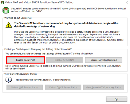 2) [Enable SecureNAT] 버튼을 클릭해 DHCP 서버를 활성화합니다.