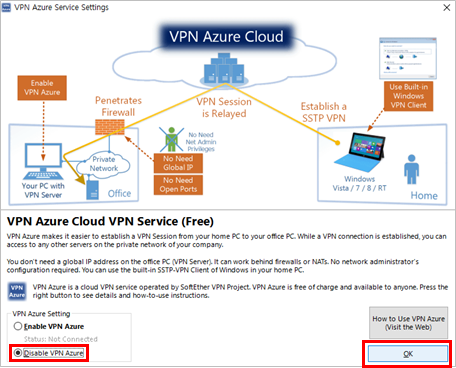 6) Azure Cloud는 사용하지 않으므로 ‘Disable VPN Azure’에 체크하고 [OK] 버튼을 클릭합니다.