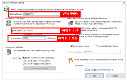 3) 아래 항목에 해당하는 내용을 입력하여 VPN 서버 접속을 설정합니다.