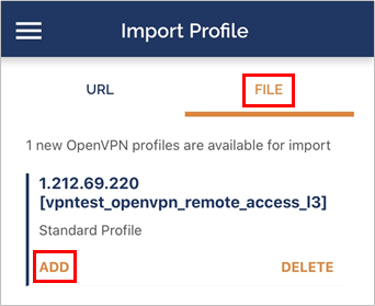 3) OpenVPN을 실행하고 상단의 File 탭에서 전송한 VPN 파일을 선택한 후 [ADD] 버튼을 클릭합니다.