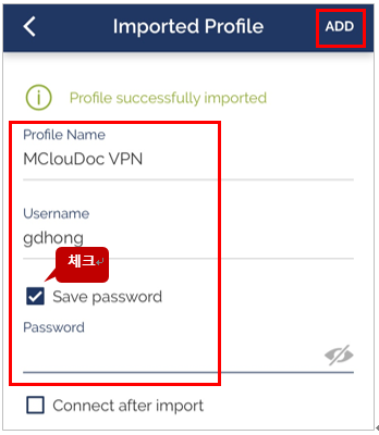 4) Imported Profile 화면에서 VPN 접속 정보를 입력한 후 [ADD] 버튼을 클릭합니다.
