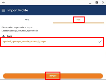 3) File 탭에서 VPN 파일이 전송된 위치로 이동해 파일을 선택한 후 하단의 [IMPORT] 버튼을 클릭합니다.