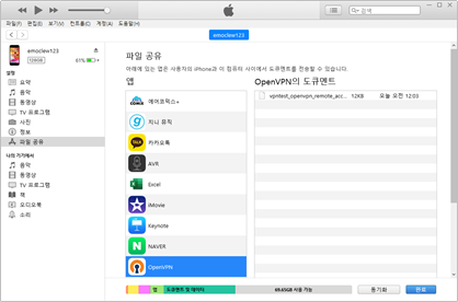 1) itunes를 이용해 관리자에게 제공받은 [VPN 파일(xxxxd_openvpn_remote _access_l3.ovpn)]을 기기로 전송합니다.