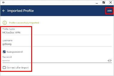 4) Imported Profile 화면에서 VPN 접속 정보를 입력한 후 [ADD] 버튼을 클릭합니다.