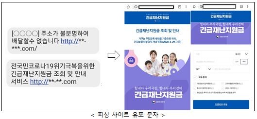 '긴급재난금 조회 및 안내 서비스' 형태의 피싱 사이트가 가짜 문자를 통해 빠르게 유포되고 있습니다.