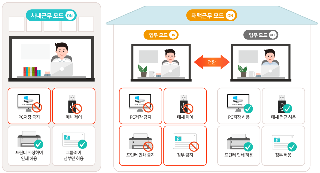 재택근무 시에는 업무모드가 ON인 경우에만 지정된 보안 정책이 적용됩니다.