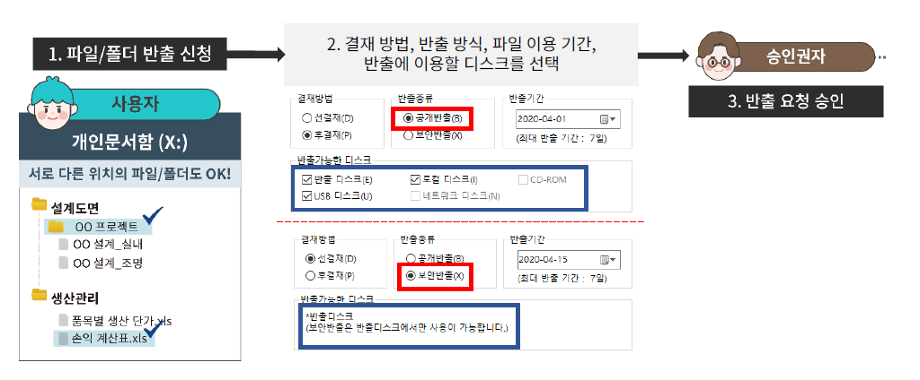 공개/보안 반출 방식에 따라 반출 가능 디스크가 달라지는 등의