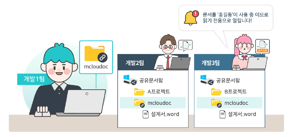 공유중인 폴더 에서 다른 사용자가 열람중인 파일은 읽기 전용으로 제공하여 파일 유실을 방지합니다.