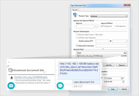 문서 링크 기능으로 사내/계열사/외부 협력사와 빠르게 파일을 공유할 수 있습니다.