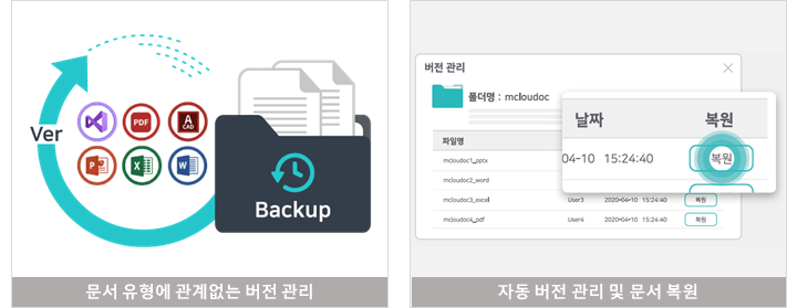 엠클라우독은 파일 형식에 관계 없이 저장 시, 자동으로 버전 관리되어 이전 버전으로 간단히 복원할 수 있습니다.