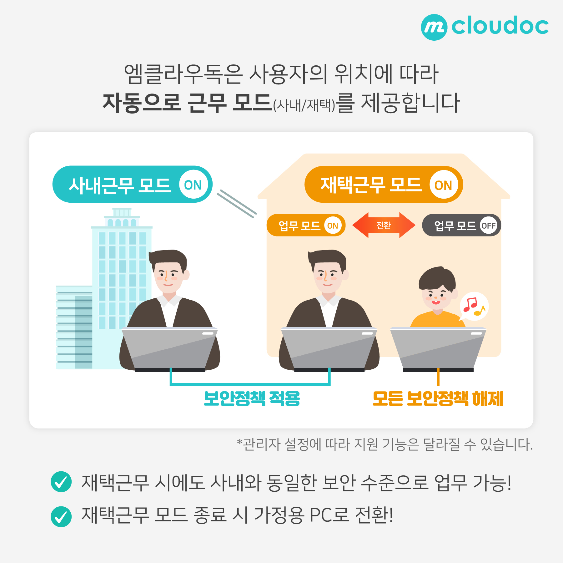 엠클라우독은 사용자의 위치에 따라 자동으로 근무 모드(사내/재택)를 제공합니다.