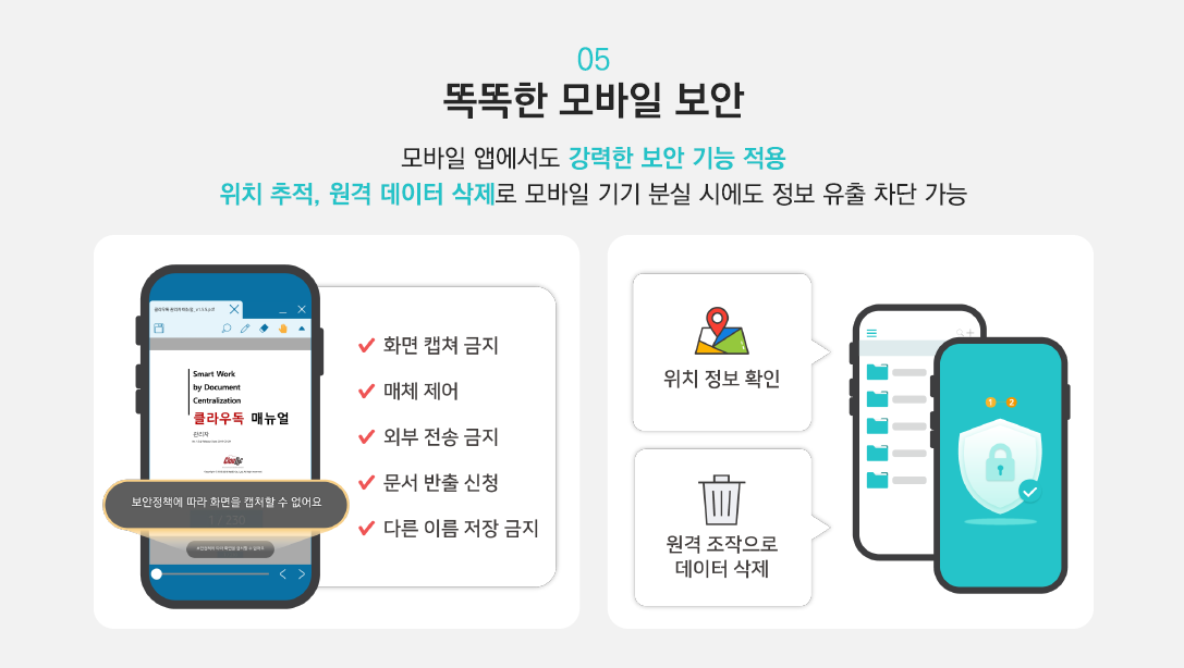 화면 캡쳐 금지, 문서 반출과 같은 강력한 보안 정책은 물론이고