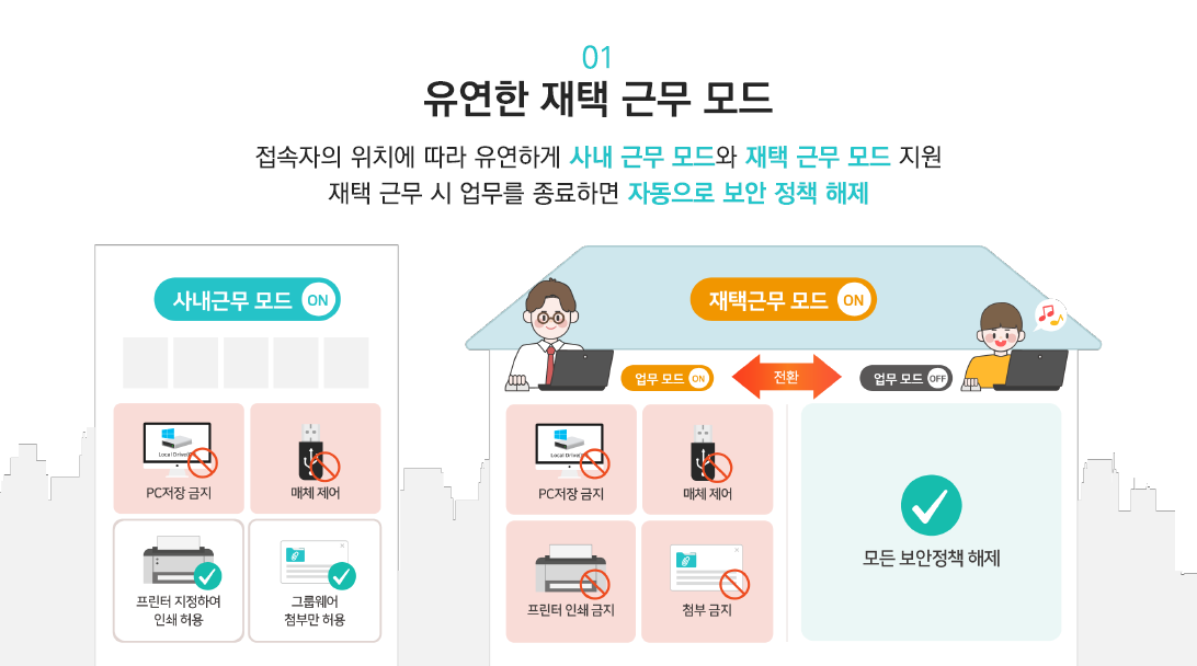 재택근무 시에는 업무모드가 ON인 경우에만 지정된 보안 정책이 적용됩니다.