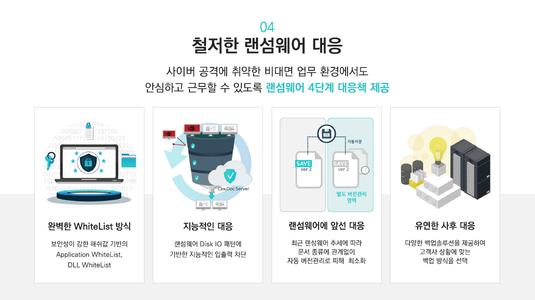 안심하고 근무할 수 있는 랜섬웨어 4단계 대응책을 제공합니다.