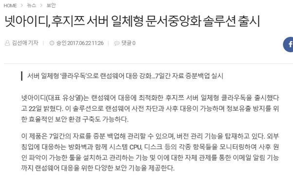 보안뉴스: 랜섬웨어 공포 확산...문서중앙화 솔루션 ‘급부상’ 中 유상열 대표님 쿼트