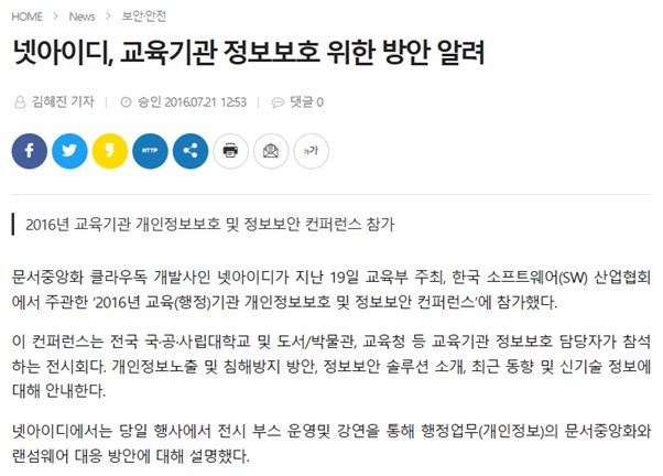 문서중앙화 클라우독 개발사인 넷아이디가 지난 19일 교육부 주최, 한국 소프트웨어(SW) 산업협회에서 주관한 ‘2016년 교육(행정)기관 개인정보보호 및 정보보안 컨퍼런스’에 참가했다.이 컨퍼