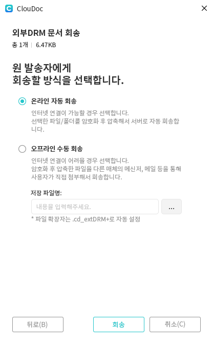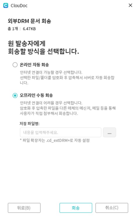 오프라인으로 회송할 때는 회송 파일이 로컬 디스크에 압축 및 암호화됩니다.