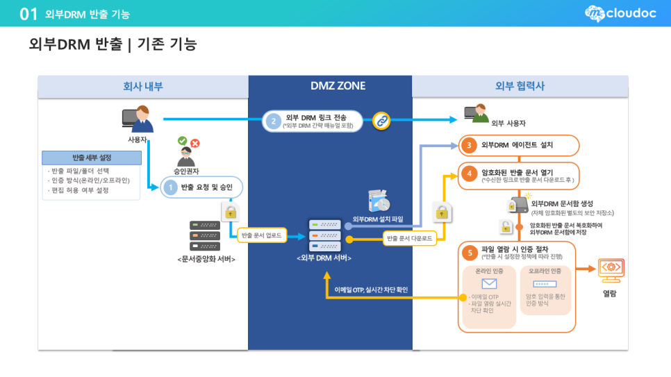 2. 반출된 문서는 DMZ Zone(Demilitarized Zone) 내, 외부 DRM 서버로 업로드