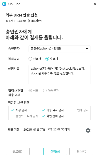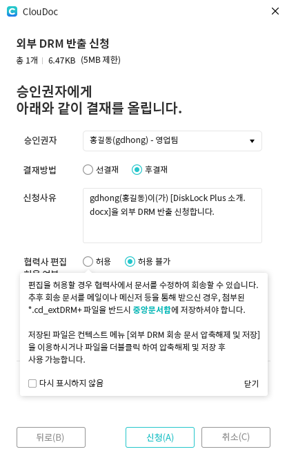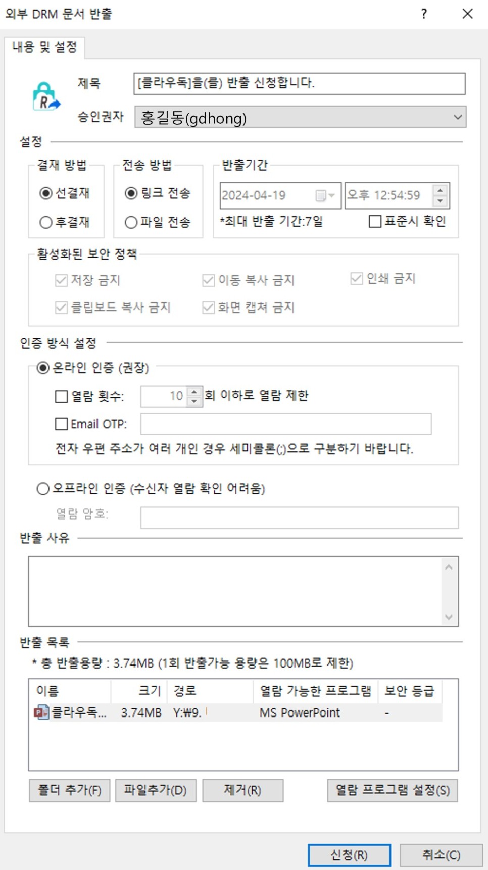 3️⃣ 승인권자에게 결재를 올리면서 외부 DRM 반출을 신청합니다.