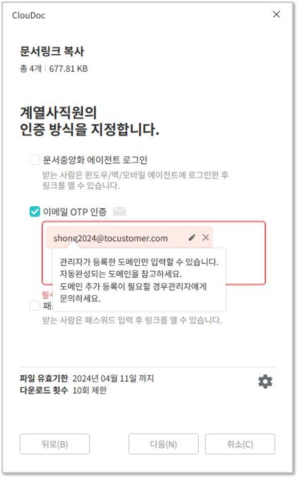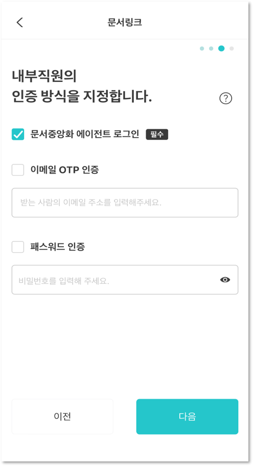 2. 수신자의 인증 방식: 에이전트 로그인/이메일 OTP 인증/패스워드 인증 중 설정할 수 있습니다.