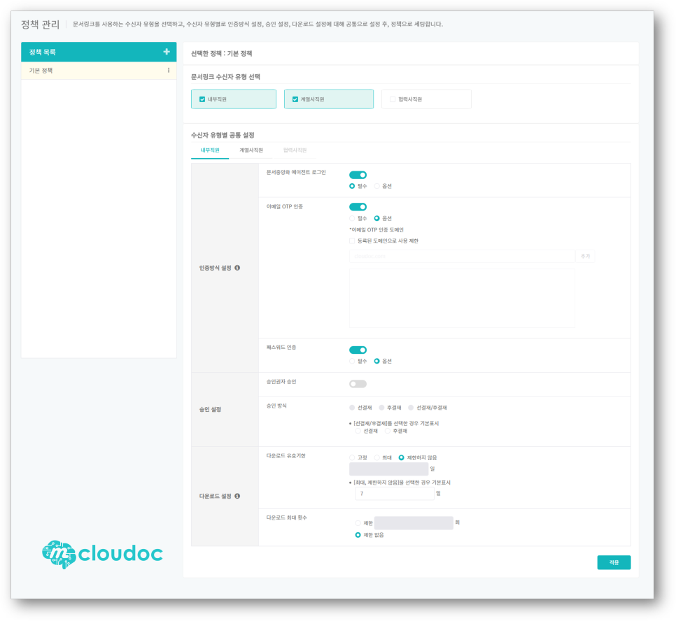 수신자 유형별로 인증 방식 설정, 승인 설정, 다운로드 설정에 대해 공통으로 설정 후