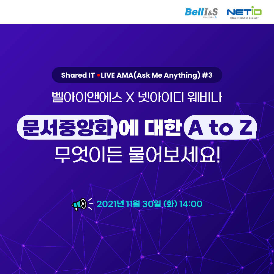 안녕하세요. 인공지능 문서중앙화 엠클라우독 입니다 :) 날씨가 부쩍 추워졌으니 모두 감기 조심하시길 바랍니다. 오늘은 반가운 '웨비나' 소식을 들고 찾아왔습니다. 🙋♀️🙋♂️🙋♀️🙋♂️ 넷아이디와 벨아이앤에스가 선보이는 첫 웨비나! 문서중앙화 A to Z 무엇이든 물어보세요 ! 2021년 11월 30일 화요일 14:00 ~ 15:05 포스트 코로나 시대, 재택근무, 협업 시스템 등의 비대면 이슈가 늘어나면서 효율적인 업무 환경으로 '문서중앙화'에 대한 관심이 증가하고 있는데요! 그동안 미뤄왔던 다양한 고민에 대해서 속 시원히! 풀 수 있는 시간! 이번 웨비나에서 문서중앙화에 대한 모든 궁금증을 해소해보세요! 문서중앙화 도입부터 운영까지 ! 문서중앙화 웨비나, 누구에게 도움이 될까요? 1. 문서중앙..