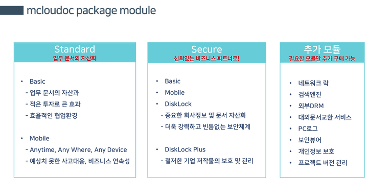 mcloudoc은 Standard, Secure 두개의 패키지 상품으로 구매가 가능합니다.
