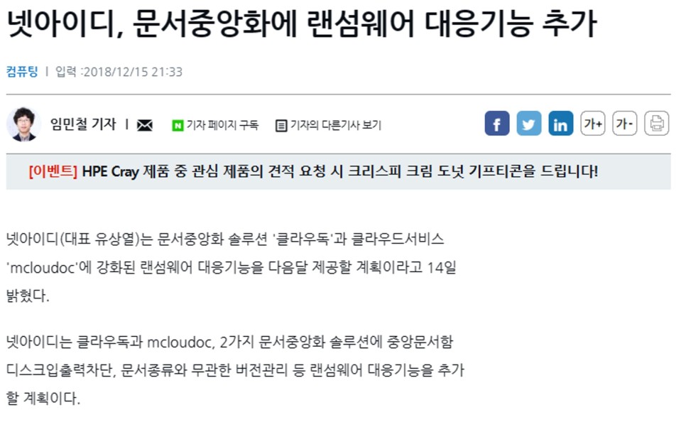 보안뉴스: 랜섬웨어 공포 확산...문서중앙화 솔루션 ‘급부상’ 中 유상열 대표님 쿼트